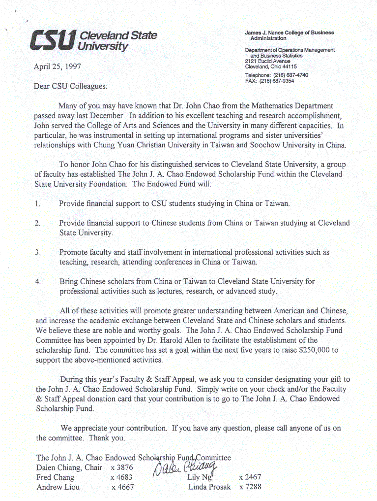[ John Chao Scholarship | Lily Ng's Memo | Establilshment | Guidelines | Committee | Biography | Recipients]